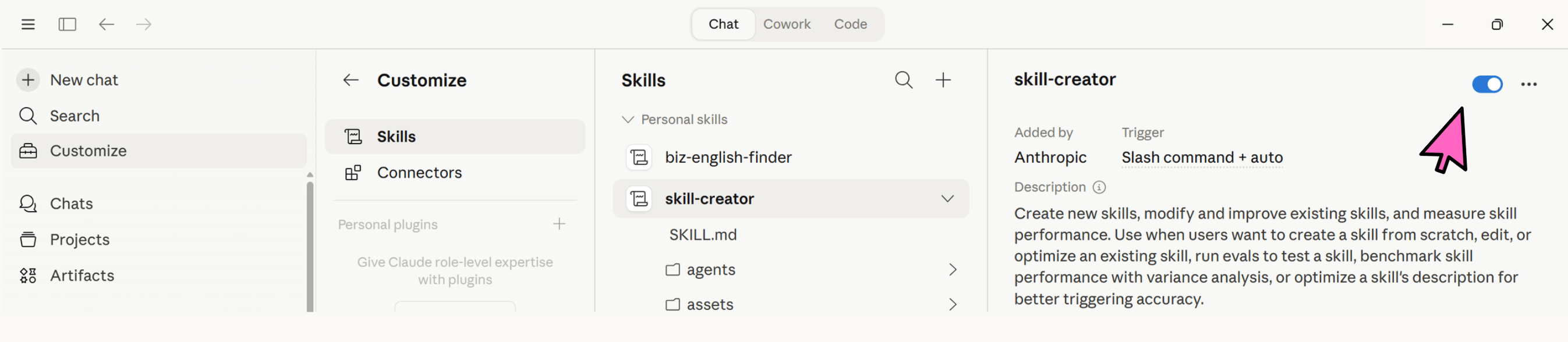 Ова е достапно само на desktop верзијата на Claude Cowork. Одeте во менито Customize. Таму ќе го видите менито Skills. Проверете дали е вклучено skill-creator во десниот агол.